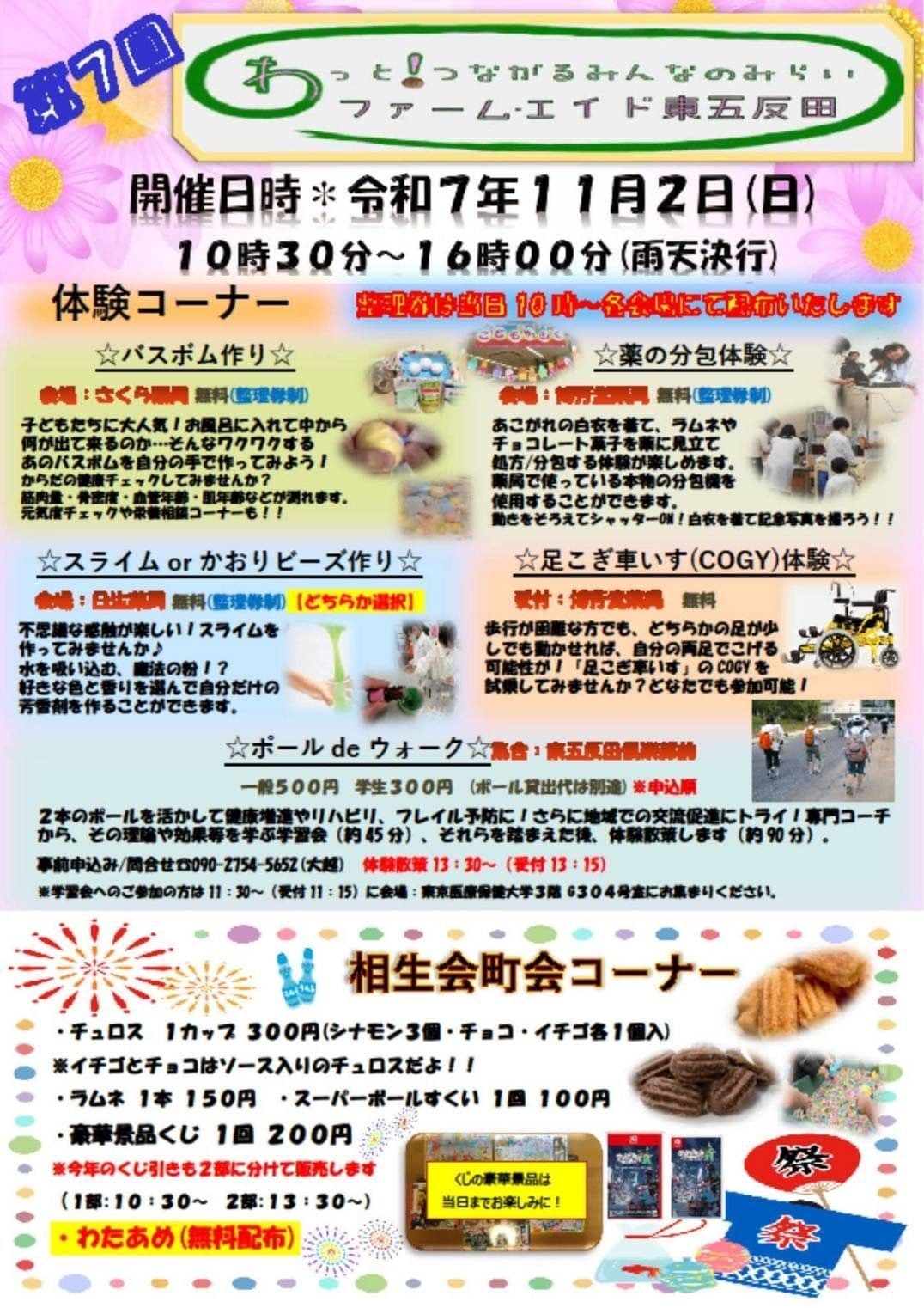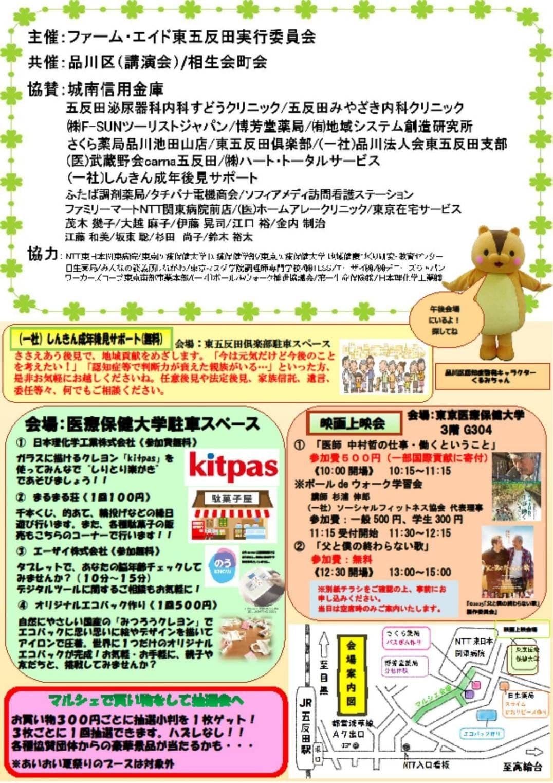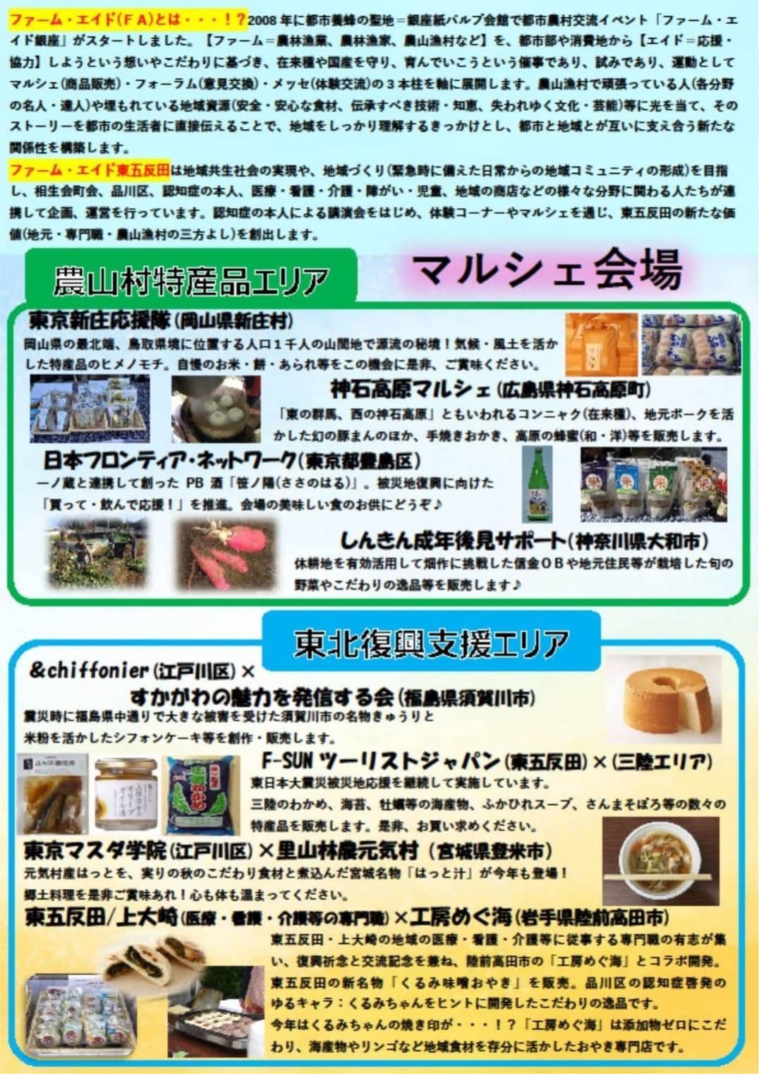 ファーム・エイド東五反田は、地域共生社会の実現や、地域づくり(緊急時に備えた日常からの地域コミュニティの形成)を目指し、相生会町会、品川区、認知症の本人、医療・看護・介護・障がい・児童、地域の商店などの様々な分野に関わる人たちが連携して企画、運営を行なっています。認知症の本人による講演会をはじめ、体験コーナーやマルシェを通じ、東五反田の新たな価値(地元・専門職・農山漁村の三方よし)を創出します。